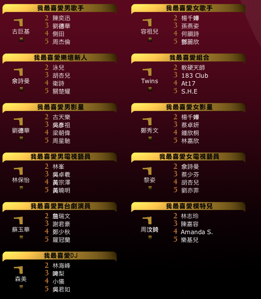 「我最喜愛男歌手」には四大天王(劉徳華、張學友、郭富城、黎明)に加え、