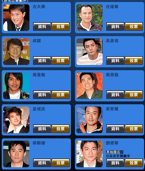 「我最喜愛男影星」は、さすが香港、豪華なメンバーが並んでいます。