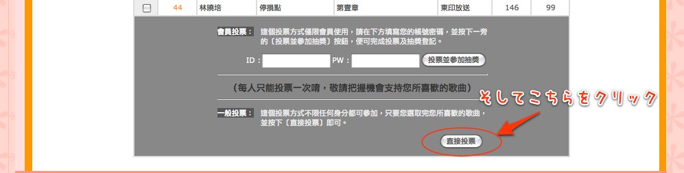あらかじめ、候補としてあげられている99曲の中から選んで投票するもので、複数の曲に投票することができますが、IPアドレスででしょうか、きちんとチェックされているようで、重複しての投票はできません。
