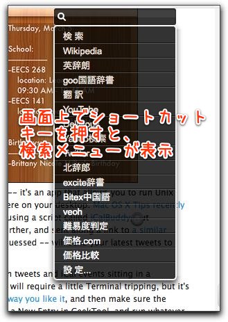 指定されたショートカットキー(Windows: Control + Space Mac : Alt + Space)をクリックすることで、メニュー画面が開き、そのまま語句を入力、そして検索と、とてもスムーズに行えます。