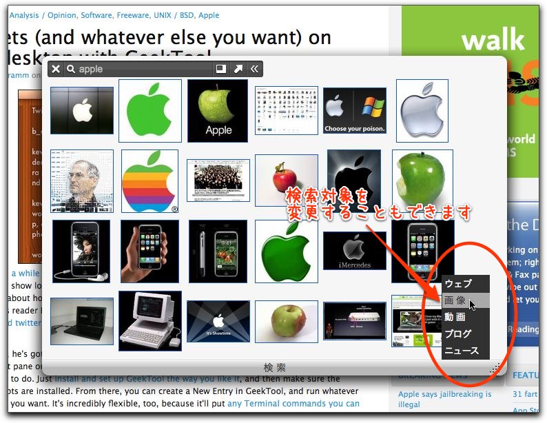 ウェブだけではなく、画像検索、動画検索、ブログ検索、ニュース検索が可能。